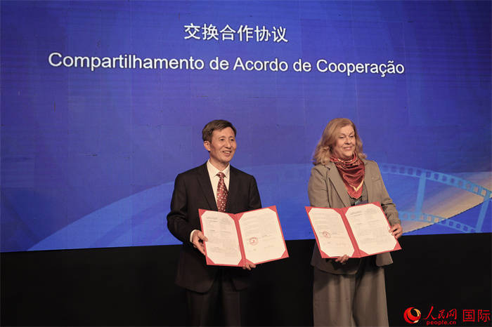 中央广播电视总台与巴西盒子媒体集团在第五届巴西“中国影视作品展播季”活动中交换影视节目播出合作协议。人民网记者 时元皓摄